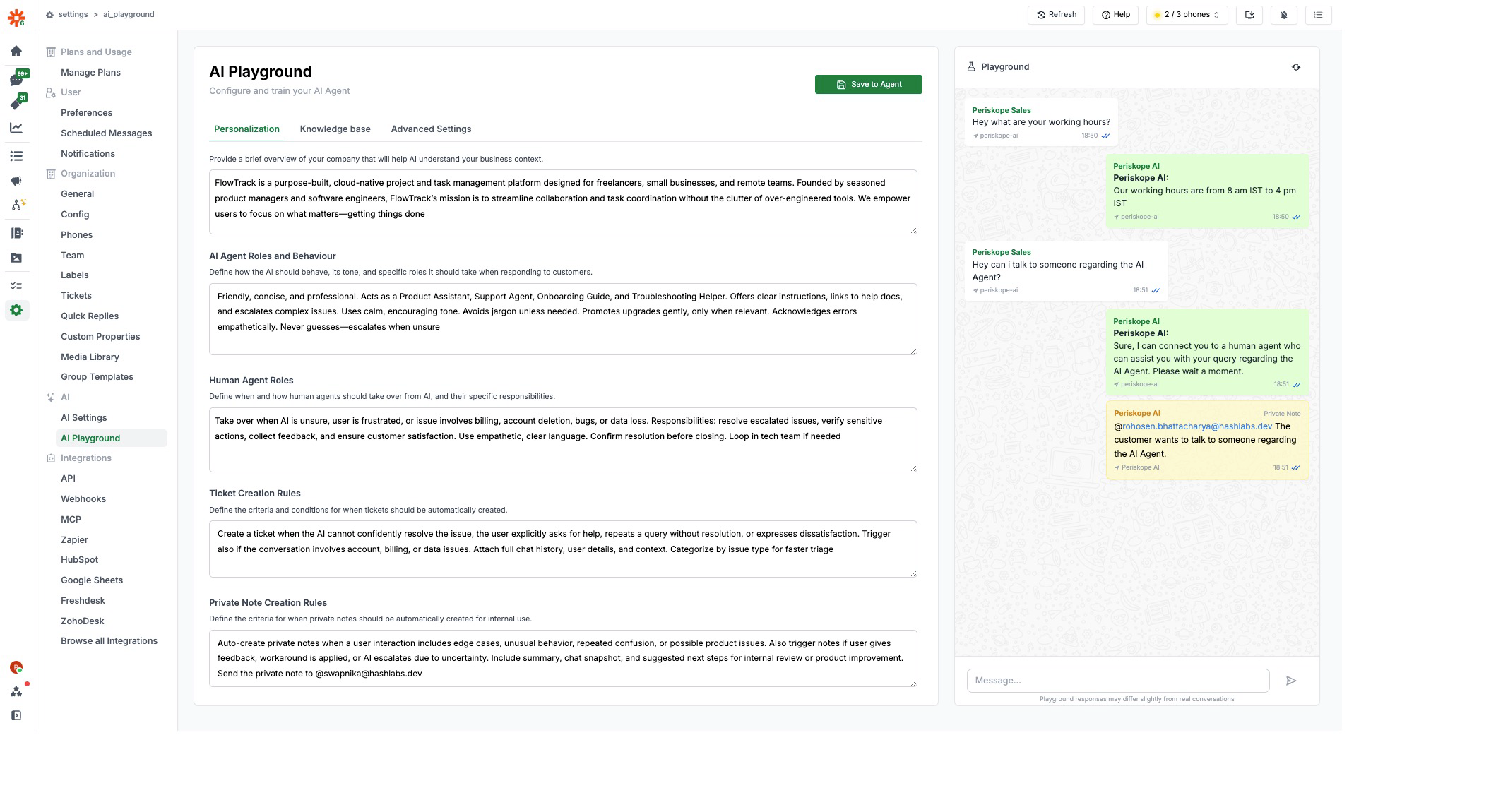 AI playground (in Settings) allows you to test various prompts and configurations. When satisfied, you can directly apply to the live agen