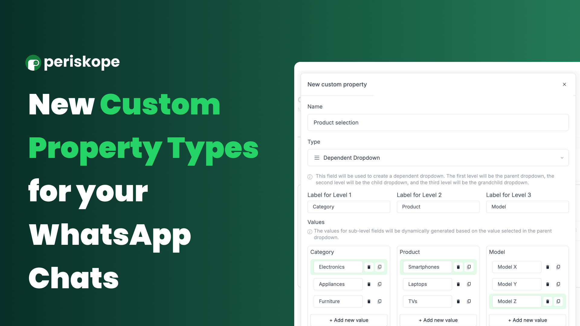 Interested? You can read more from our docs here: https://docs.periskope.app/features/custom-properties-v2