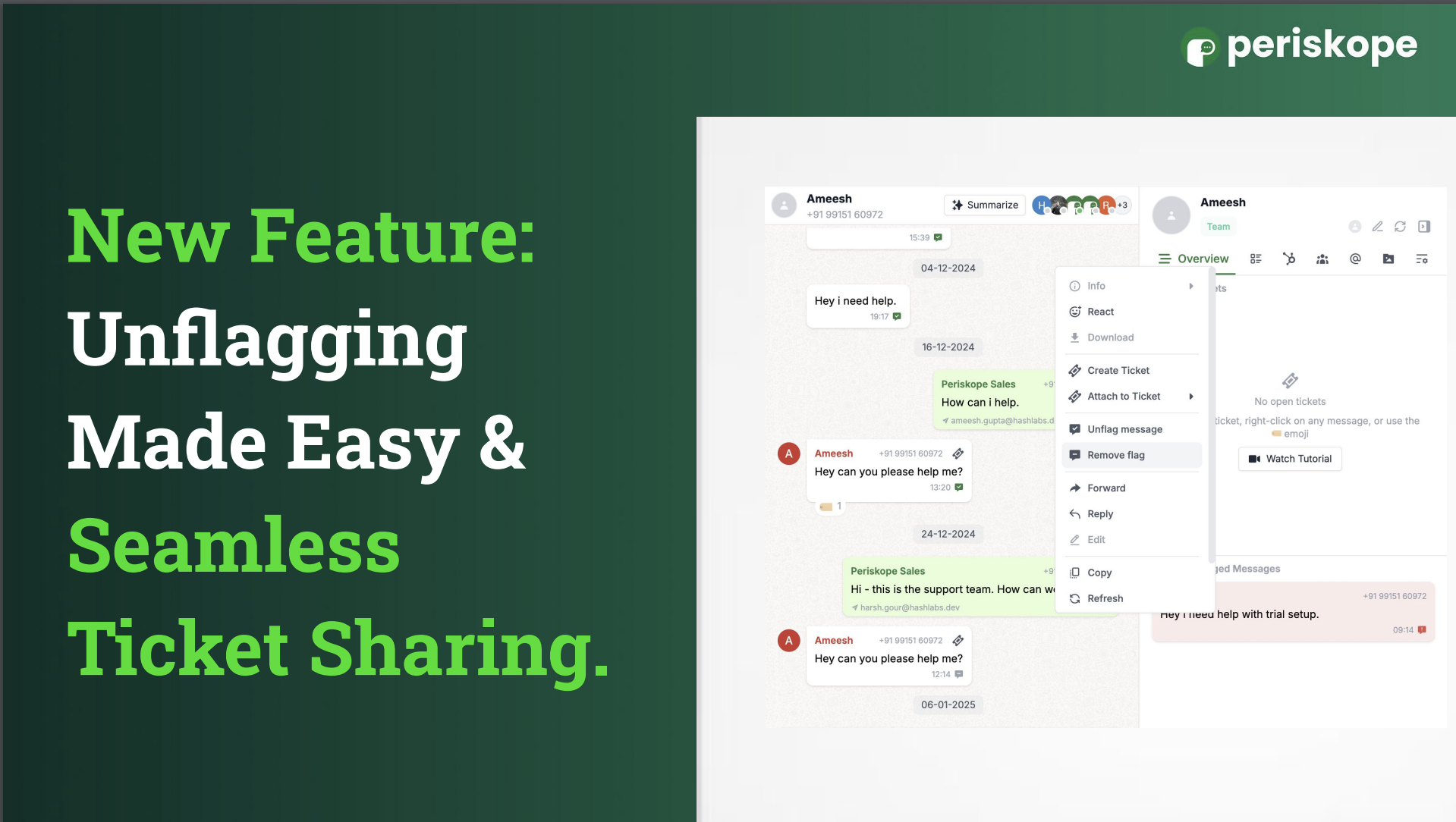 2️⃣ Ticket Sharing Across Platforms: Whether it’s via email, WhatsApp, slack or text, you can now share tickets directly from Periskope’s right-hand panel. Simply select the ticket, choose the “Share Ticket” option from the right-hand panel, and send it across platforms seamlessly. 📤