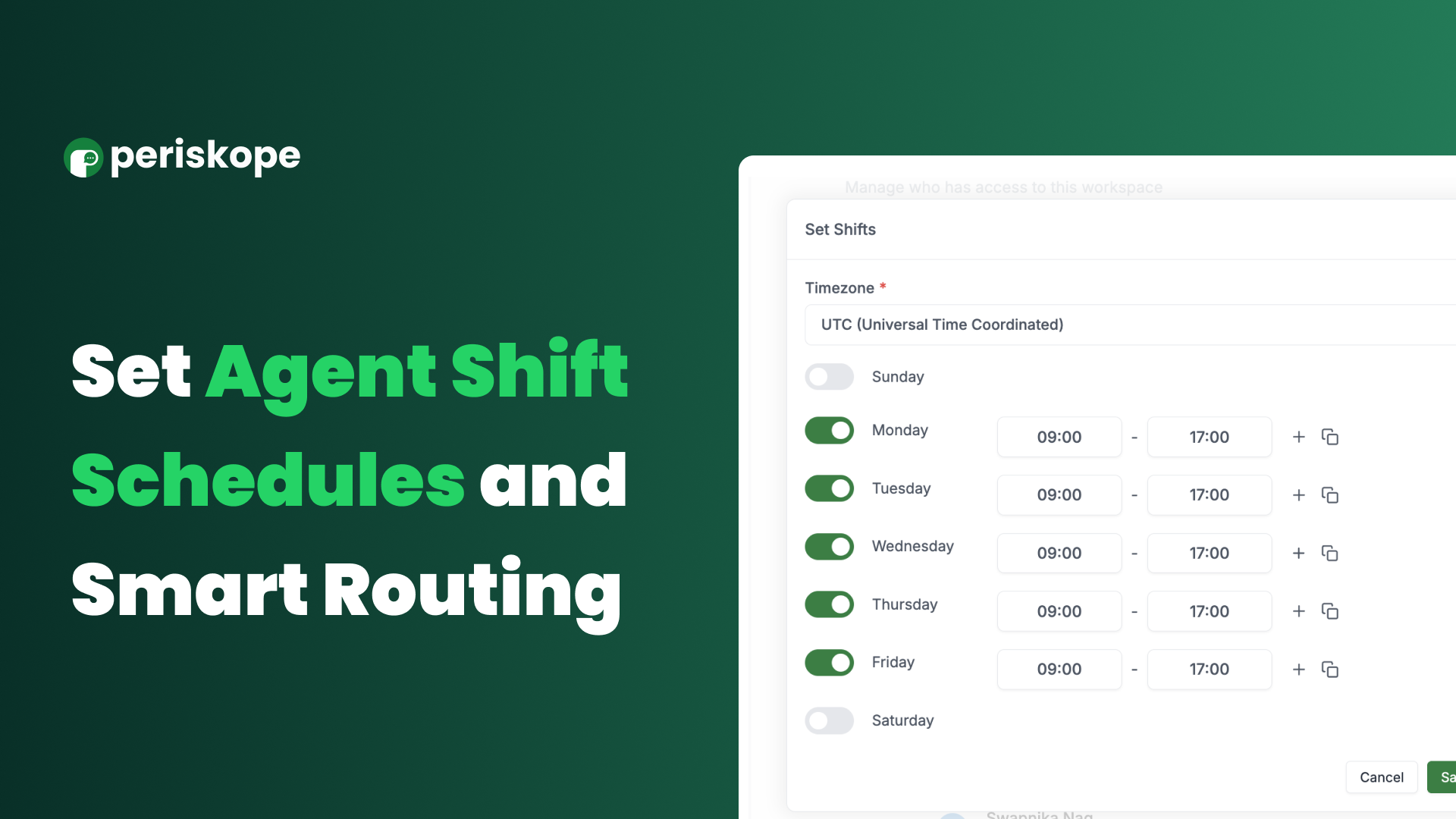 Admins can now define each agent’s availability in advance by setting shift schedules (e.g., Mon–Fri, 9 am–6 pm UTC). Only agents in an active shift will be considered for chat and ticket assignment—making it fair, predictable, and easier to manage handovers.