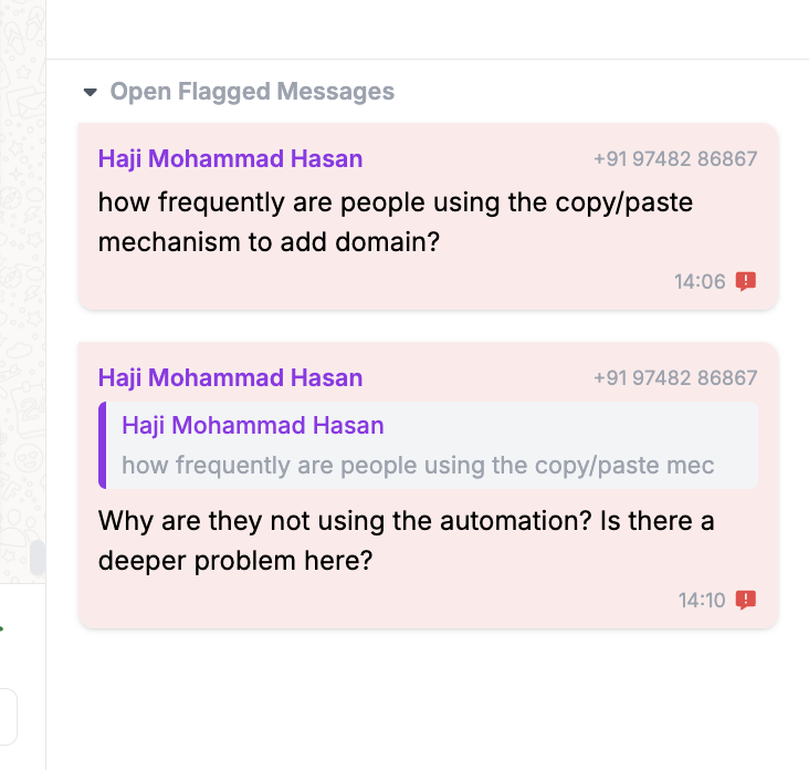 When multiple messages get flagged, they are listed on the right panel of the chat. But to unflag or remove flag, one has to click on the flagged message, then get scrolled to the message on the chat, and then unflag it. I think if there’s an easier way to do this, like unflag by right clicking on the flagged message in the right panel itself, that’ll reduce steps and increase efficiency.